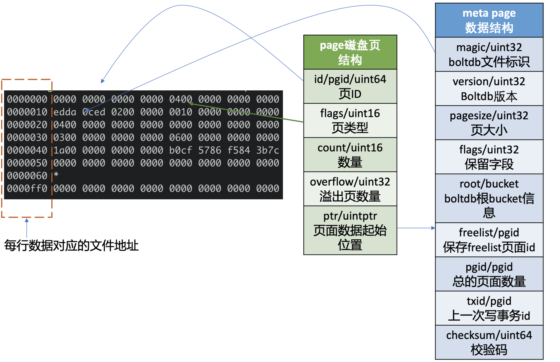 下图左边的十六进制是执行如下bbolt dump命令,所打印的boltdb第0页的数据,图的右边是对应的page磁盘页结构和meta page的数据结构。