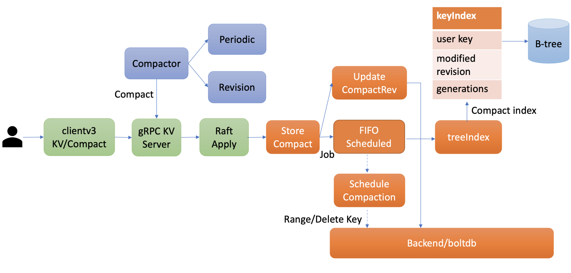 当你通过API发起一个Compact请求后,KV Server收到Compact请求提交到Raft模块处理,在Raft模块中提交后,Apply模块就会通过MVCC模块的Compact接口执行此压缩任务。