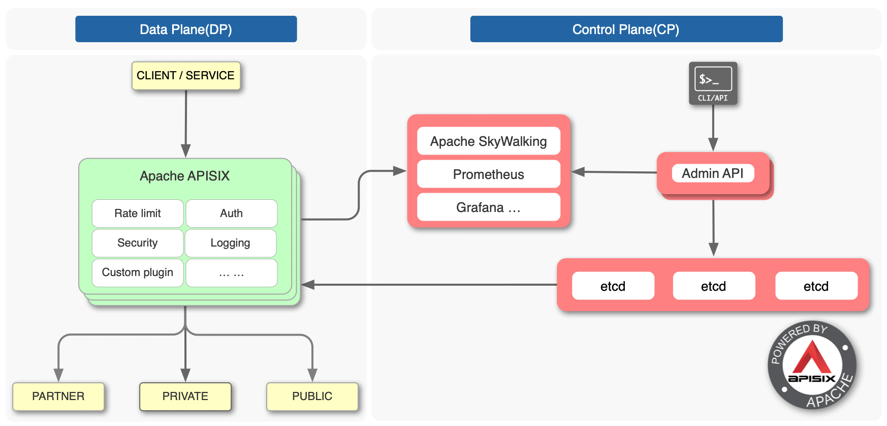 Apache APISIX详细架构图如下(引用自社区项目文档)。从图中你可以看到,它由控制面和数据面组成。