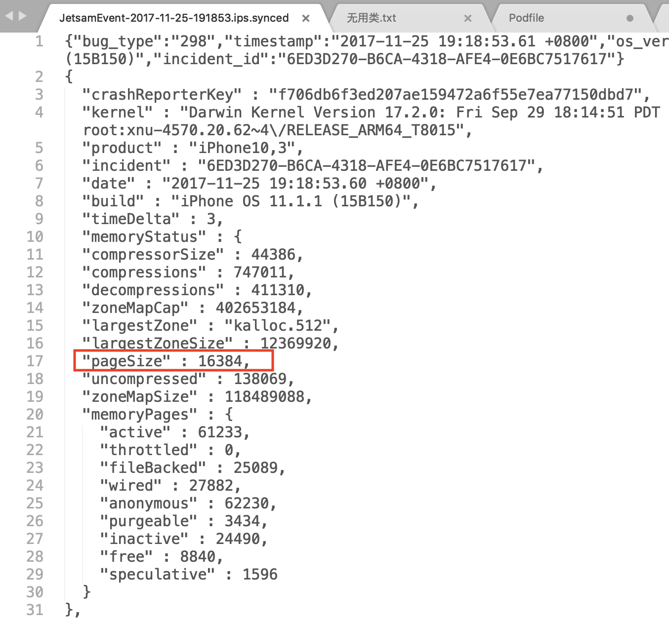 内存页大小的值,我们也可以在 JetsamEvent 开头的系统日志里找到,也就是pageSize的值。如下图红框部分所示: