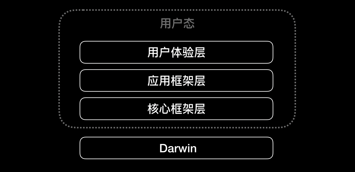 其中,用户体验层、应用框架层和核心框架层,属于用户态,是上层 App 的活动空间。Darwin是用户态的下层支撑,是iOS系统的核心。