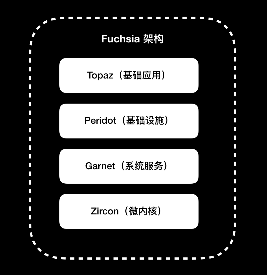 Fuchsia 架构分为四层,包括微内核的第一层 Zircon,提供系统服务的第二层 Garnet,用户体验基础设施的第三层 Peridot,Flutter所在基础应⽤的第四层 Topaz。结合 Android 系统的经验,在设计架构之初,谷歌就考虑了厂商对深度定制的诉求,使得每层都可以进行替换,模块化做得比 Android系统更加彻底。