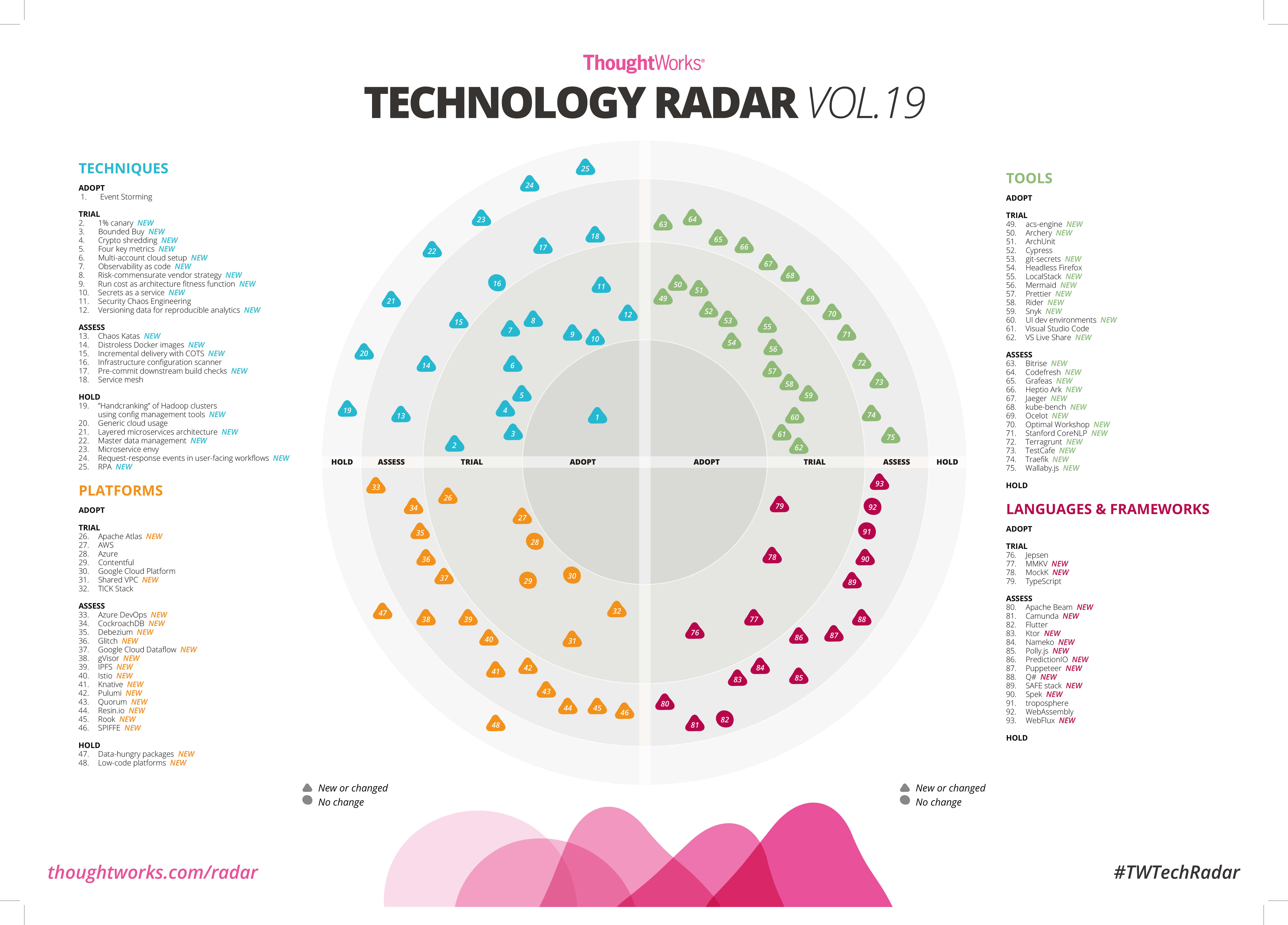 ThoughtWorks 技术雷达是由 ThoughtWorks 技术咨询委员会(Technology Advisory Board)编写的一份技术趋势报告,每6个月发布一次。ThoughtWorks 的项目多样性足够丰富,所以它能够发现诸多技术趋势。因此,相比于行业中其它的预测报告,技术雷达更加具体,更具可操作性。