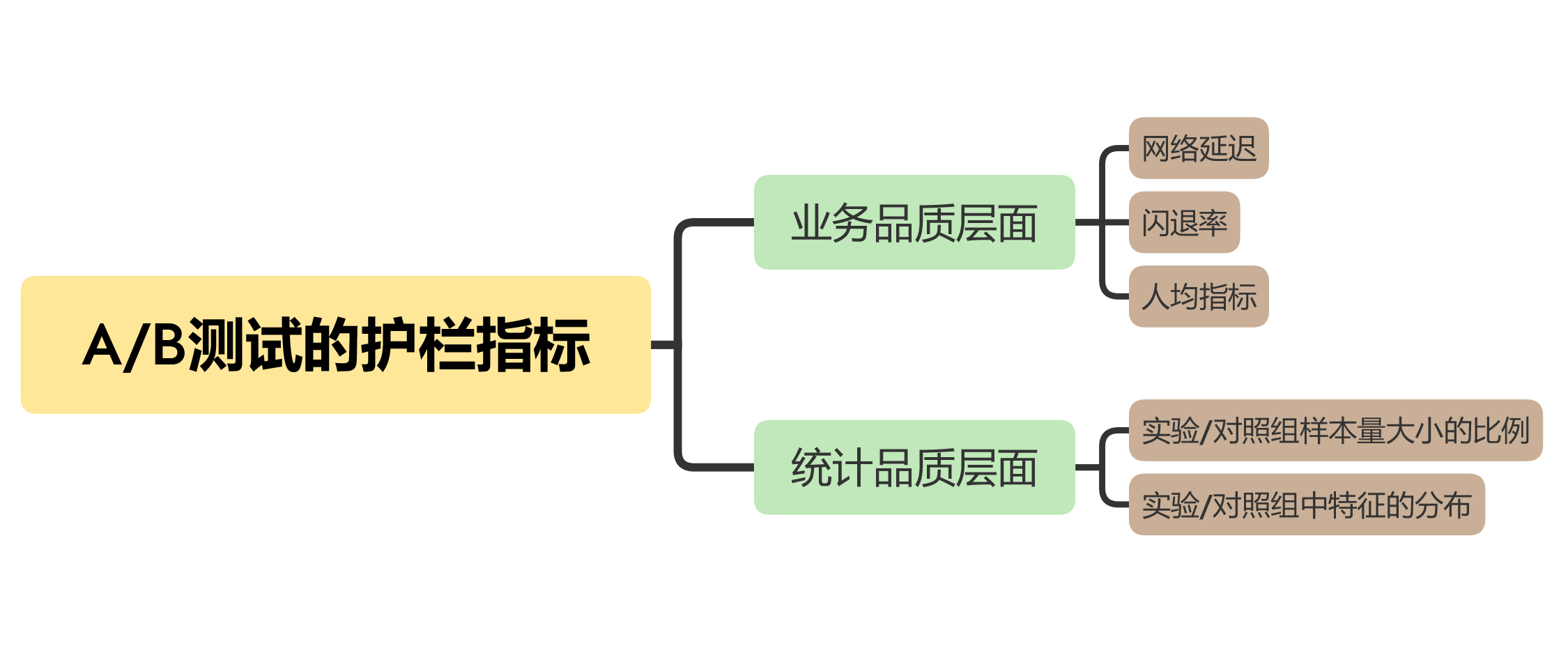 A/B测试往往改变的是业务中的某一部分指标(评价指标),所以我们很容易只关注短期的改变,却失去了对业务的大局观(比如长期的盈利能力/用户体验)的掌控或者统计上合理性的检查。因此在实践中,我会推荐每个A/B测试都要有相应的护栏指标。