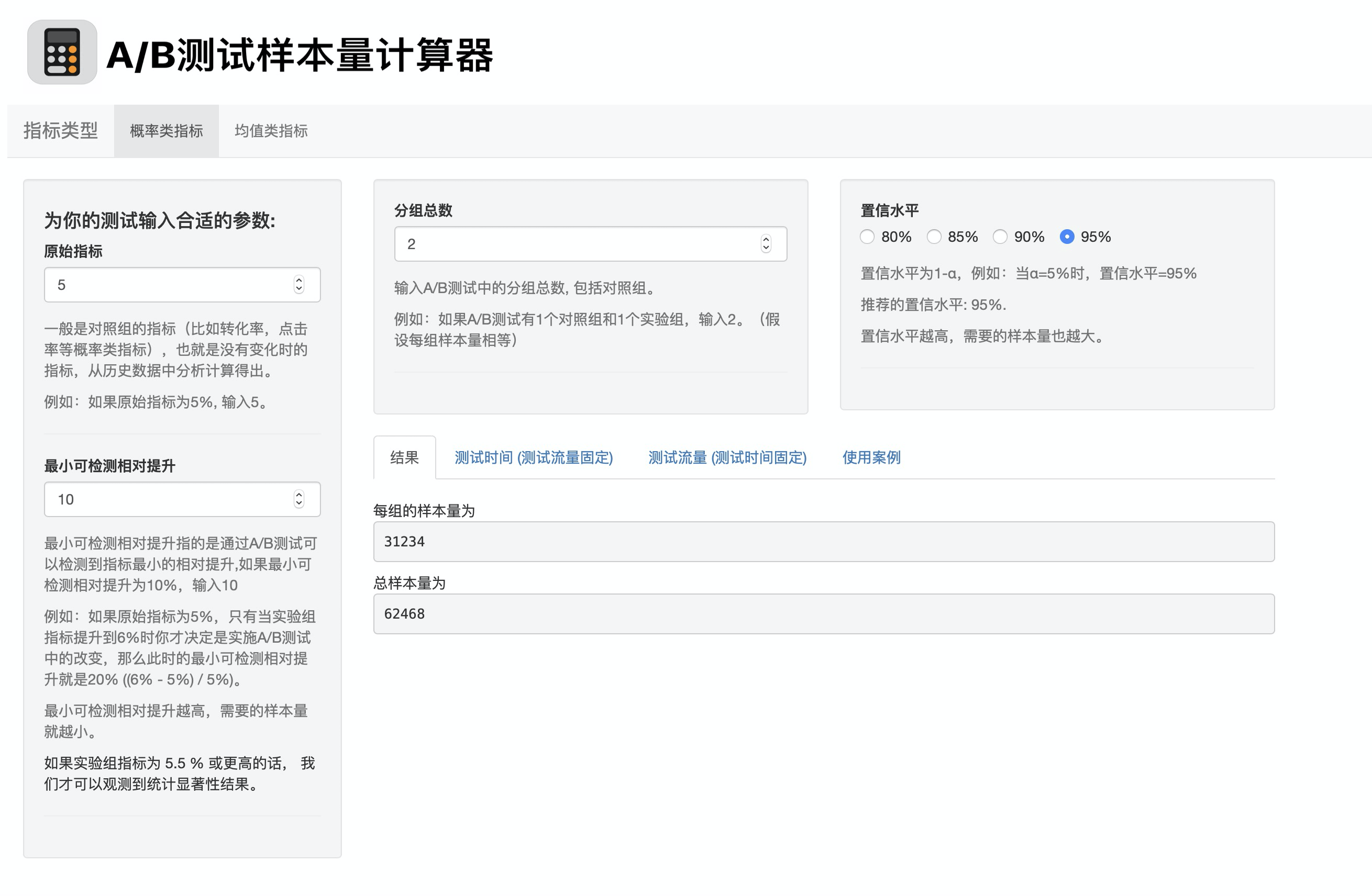 在使用案例这个版块,我会针对概率类指标和均值类指标各举一个例子,来说明具体情况下应该如何输入不同的参数。