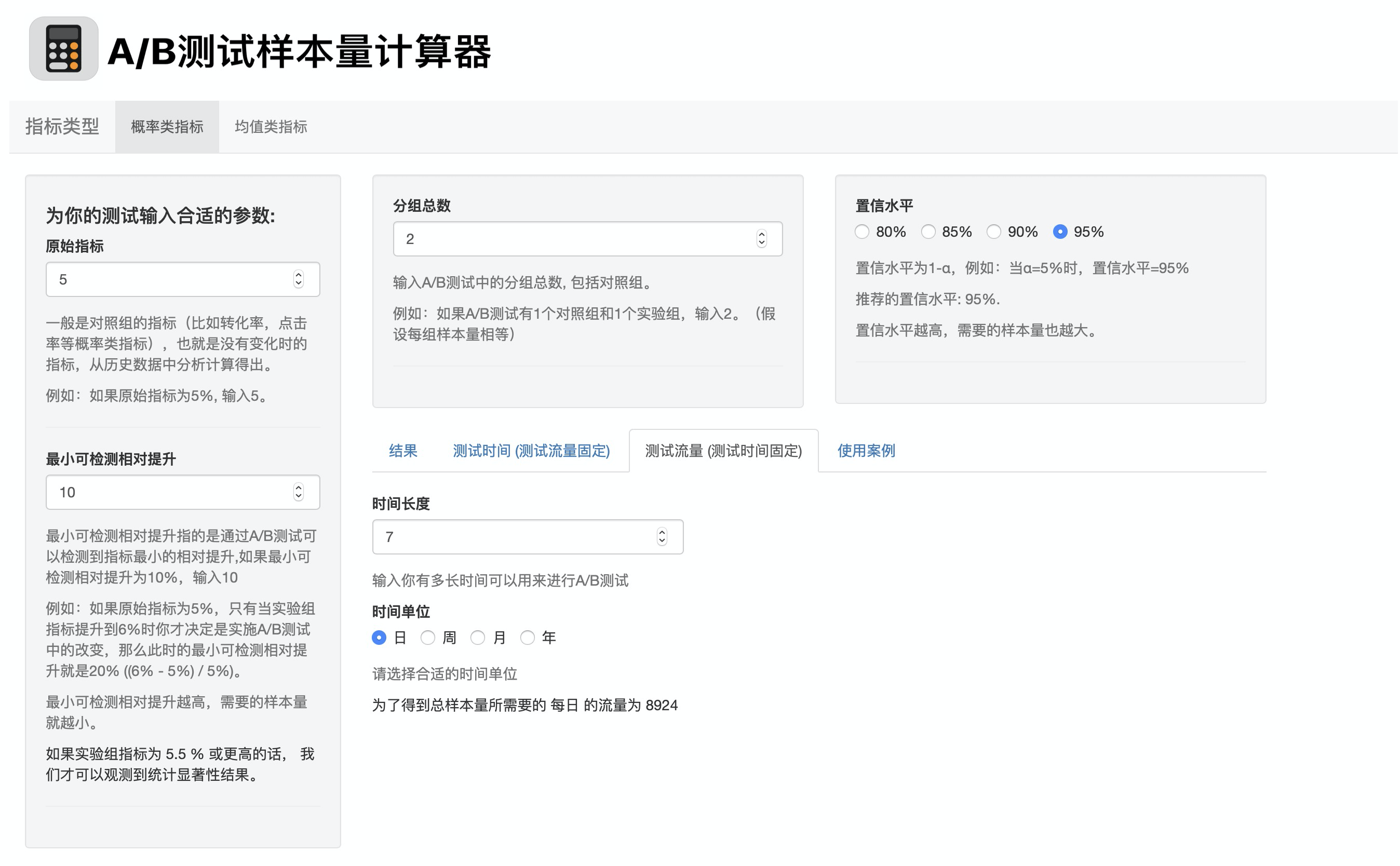 这种场景适用于时间紧急的情况,比如一周之内要出结果,一周有7天,那么输入参数后,计算得出我们每天的测试流量至少要有8924。