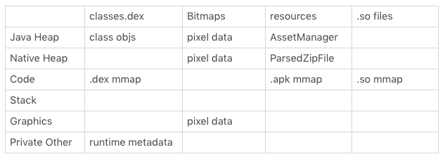 安装包中的代码、图片、资源以及so库的大小跟内存究竟有哪些关系?你可以参考下面的这个表格。