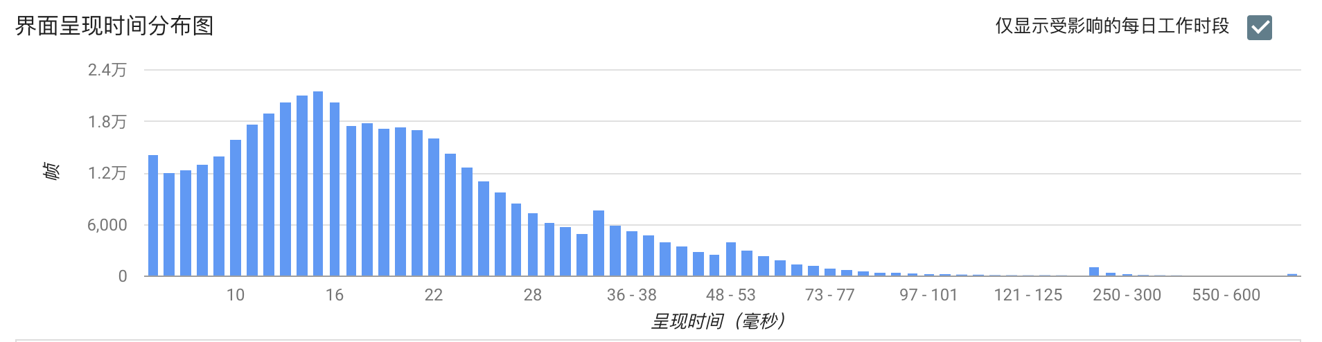 我们经常用平均帧率来衡量界面流畅度,但事实上电影的帧率才24帧,用户对于应用的平均帧率是40帧还是50帧并不一定可以感受出来。对于用户来说,感觉最明显的是连续丢帧情况,Android Vitals将连续丢帧超过700毫秒定义为冻帧,也就是连续丢帧42帧以上。