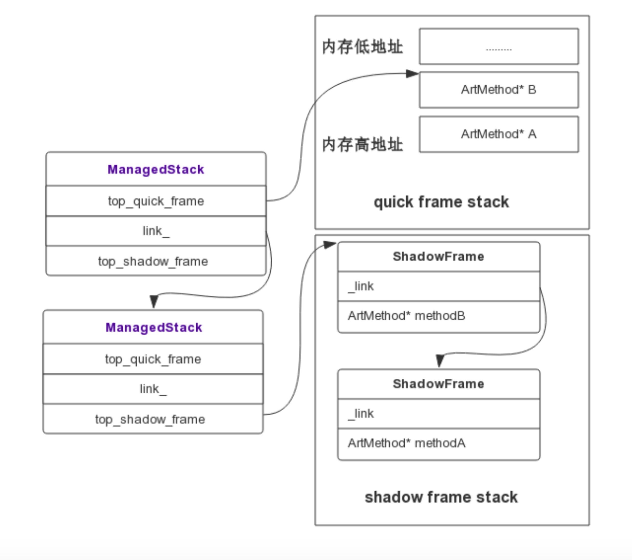 Signal Handler捕获到信号后,拿取到当前正在执行的Thread,通过Thread对象可以获取当前线程的ManagedStack,ManagedStack是一个单链表,它保存了当前的ShadowFrame或者QuickFrame栈指针,先依次遍历ManagedStack链表,然后遍历其内部的ShadowFrame或者QuickFrame还原一个可读的调用栈,从而unwind出当前的Java堆栈。通过这种方式,可以实现线程一边继续跑步,我们还可以帮它做检查,而且耗时基本忽略不计。代码可以参照:Profilo::unwind和StackVisitor::WalkStack。