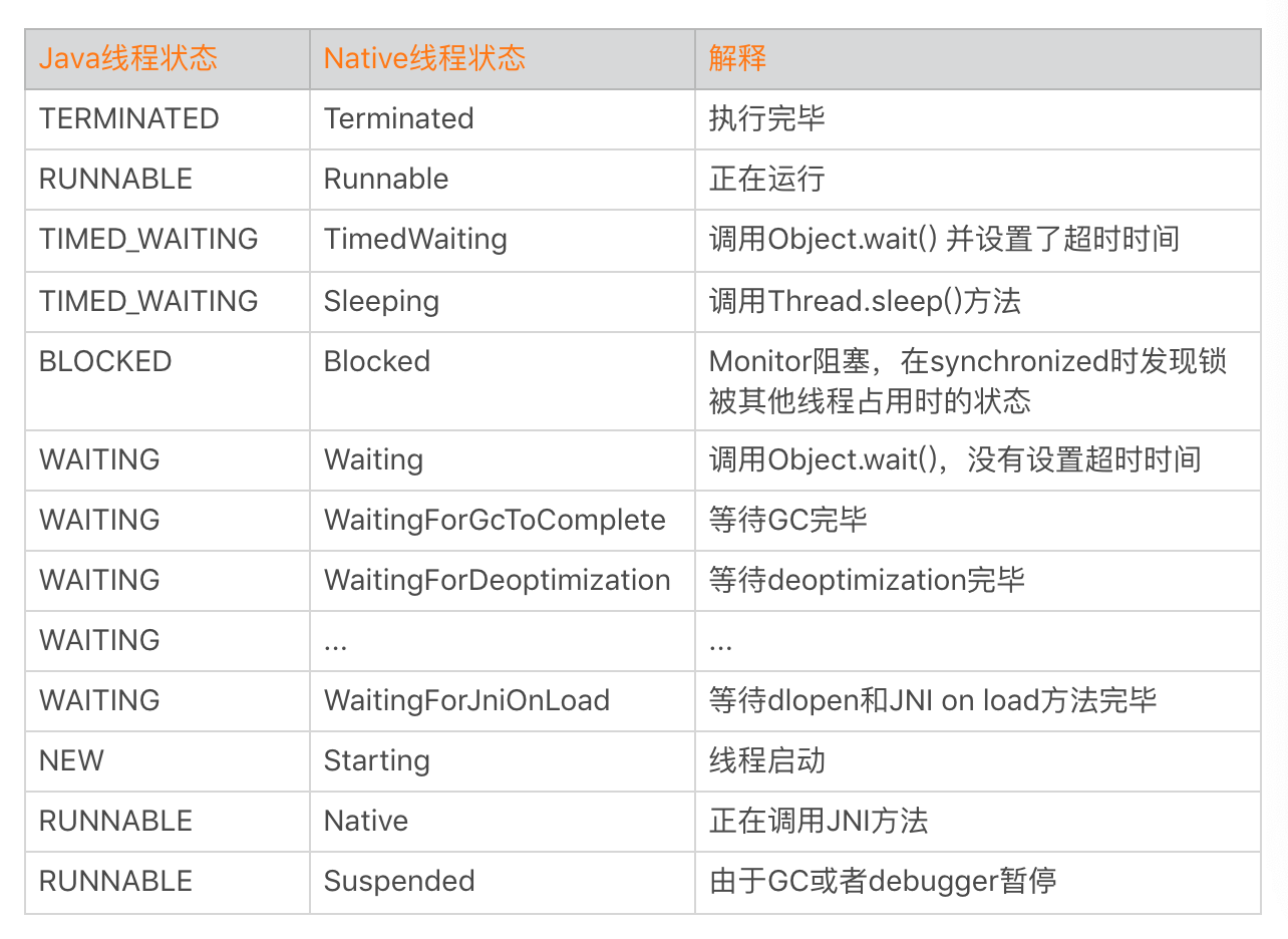 不同的Android版本Native线程的状态不太一样,例如Android 9.0就定义了27种线程状态,它能更加明确地区分线程当前所处的情况。关于Java线程状态、Native线程状态转换,你可以参考thread_state.h和Thread_nativeGetStatus。