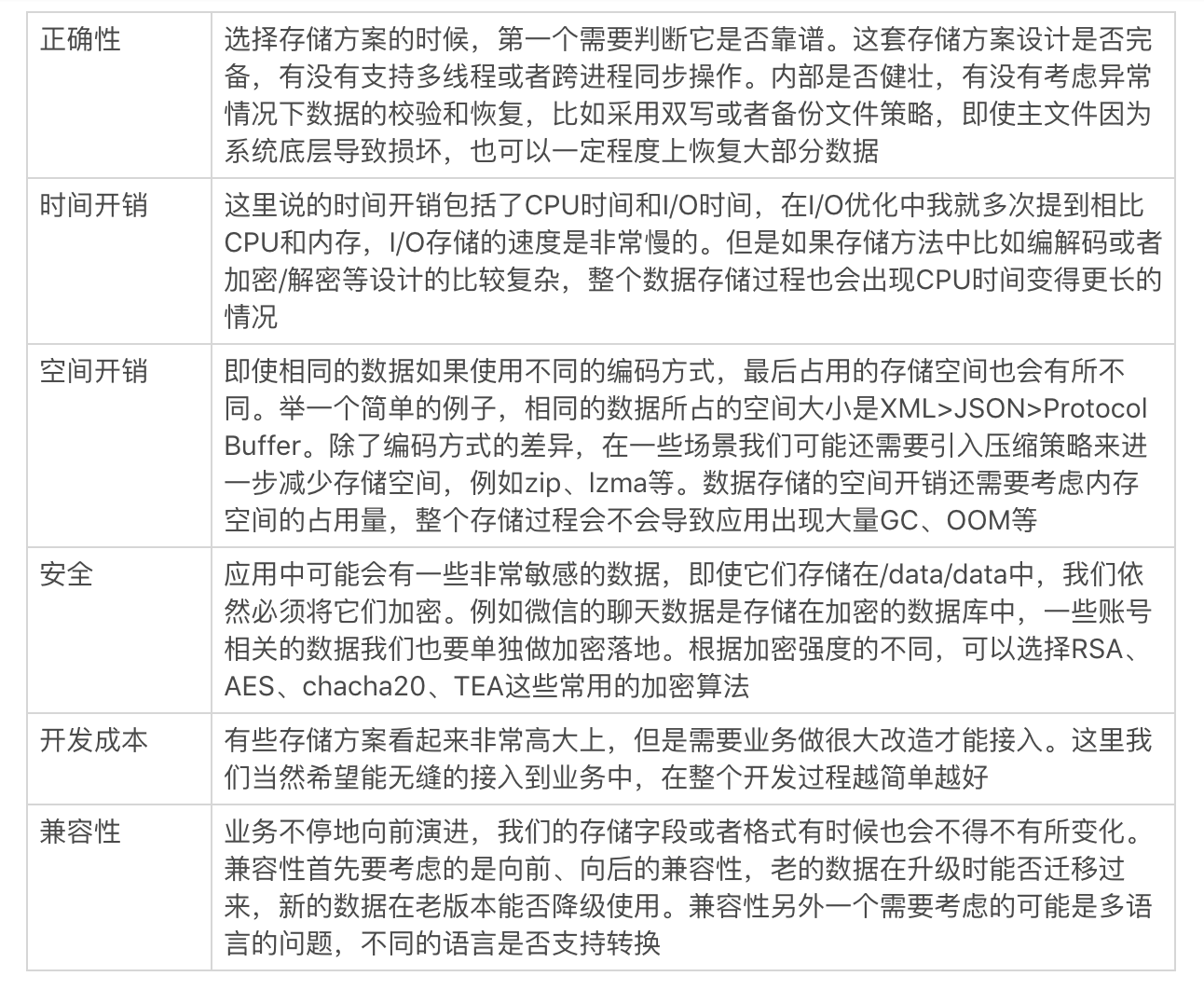 对于闪存来说,一切归根到底还是二进制的,XML、JSON它们只是提供了一套通用的二进制编解码格式规范。既然有那么多存储的方案,那我们在选择数据存储方法时,一般需要考虑哪些关键要素呢?