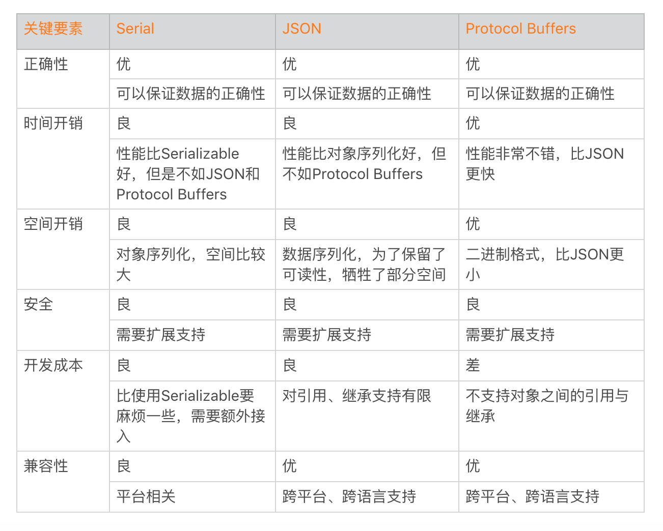 Google后面还推出了压缩率更高的FlatBuffers,对于它的使用你可以参考《FlatBuffers 体验》。最后,我再结合“六要素”,帮你综合对比一下Serial、JSON、Protocol Buffers这三种序列化方案。