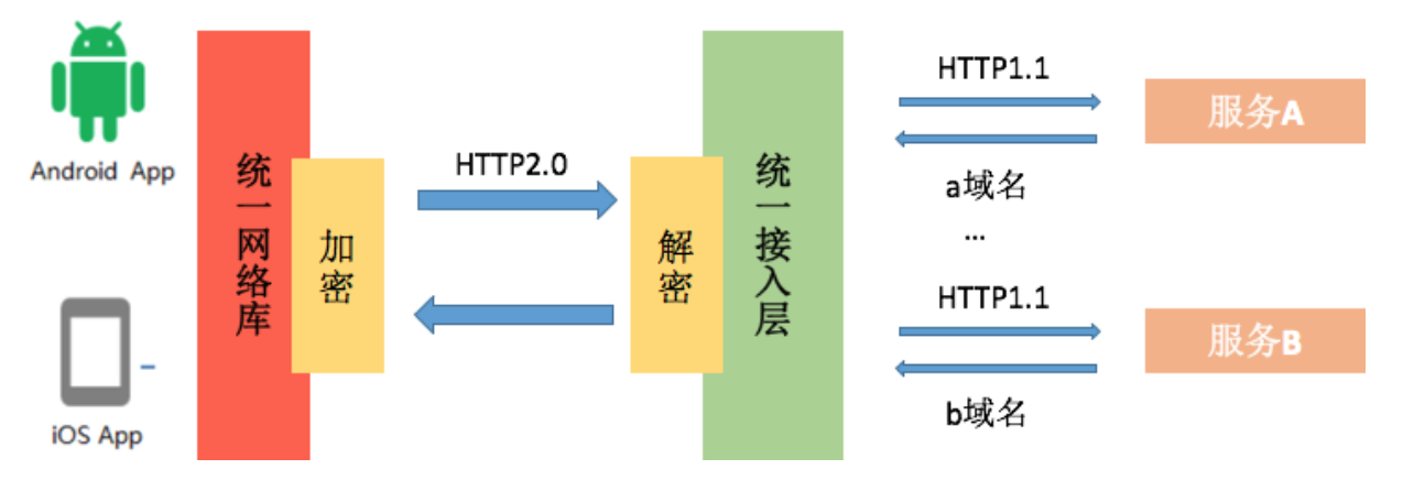 虽然H2十分强大,不过这里还有两个问题需要解决。一个是同一条H2连接只支持同一个域名,一个是后端支持HTTP/2.0需要额外的改造。这个时候我们只需要在统一接入层做改造,接入层将数据转换到HTTP/1.1再转发到对应域名的服务器。