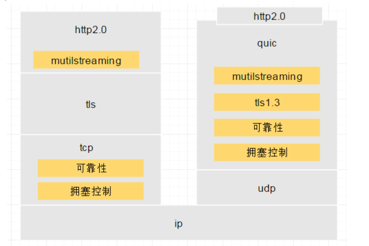 如下图所示,你可以把QUIC简单理解为HTTP/2.0 + TLS 1.3 + UDP。
