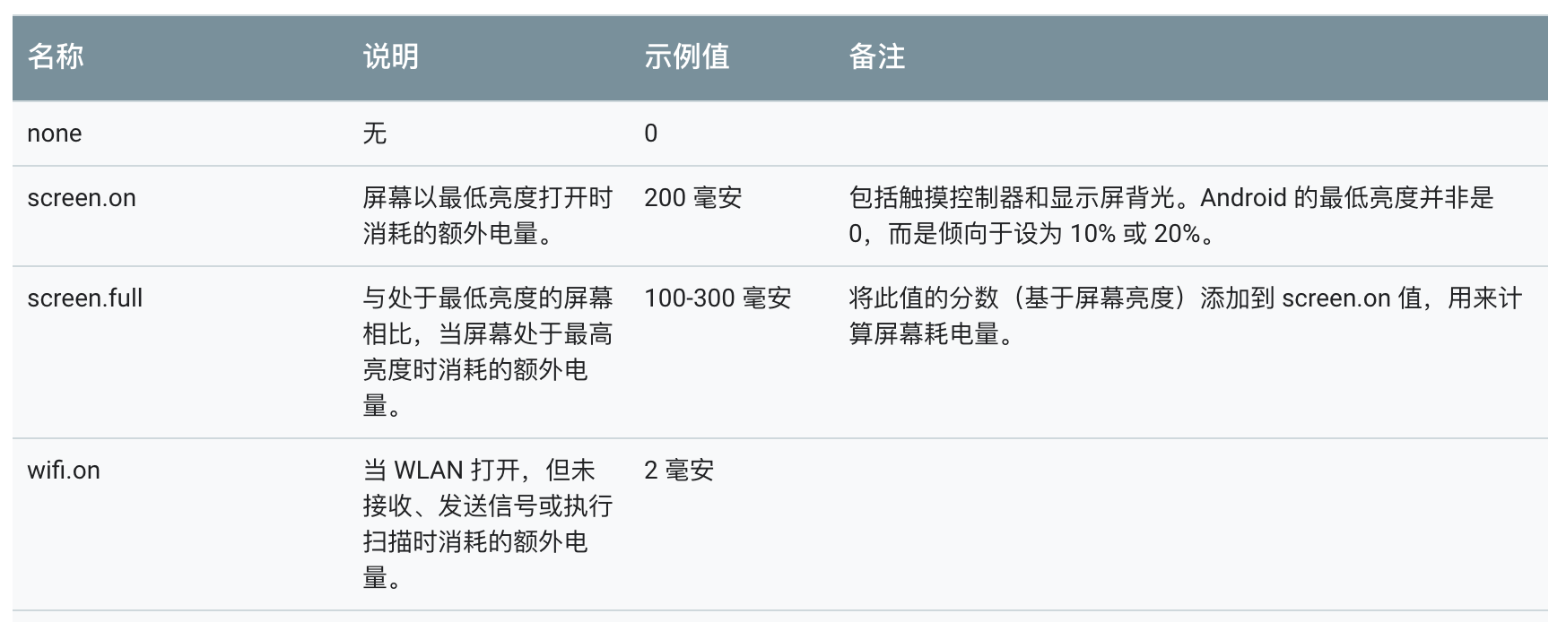 power_profiler.xml文件定义了不同模块的电流消耗值以及该模块在一段时间内大概消耗的电量,你也可以参考Android Developer文档《Android 电源配置文件》。当然电流的大小和模块的状态也有关系,例如屏幕在不同亮度时的电流肯定会不一样。