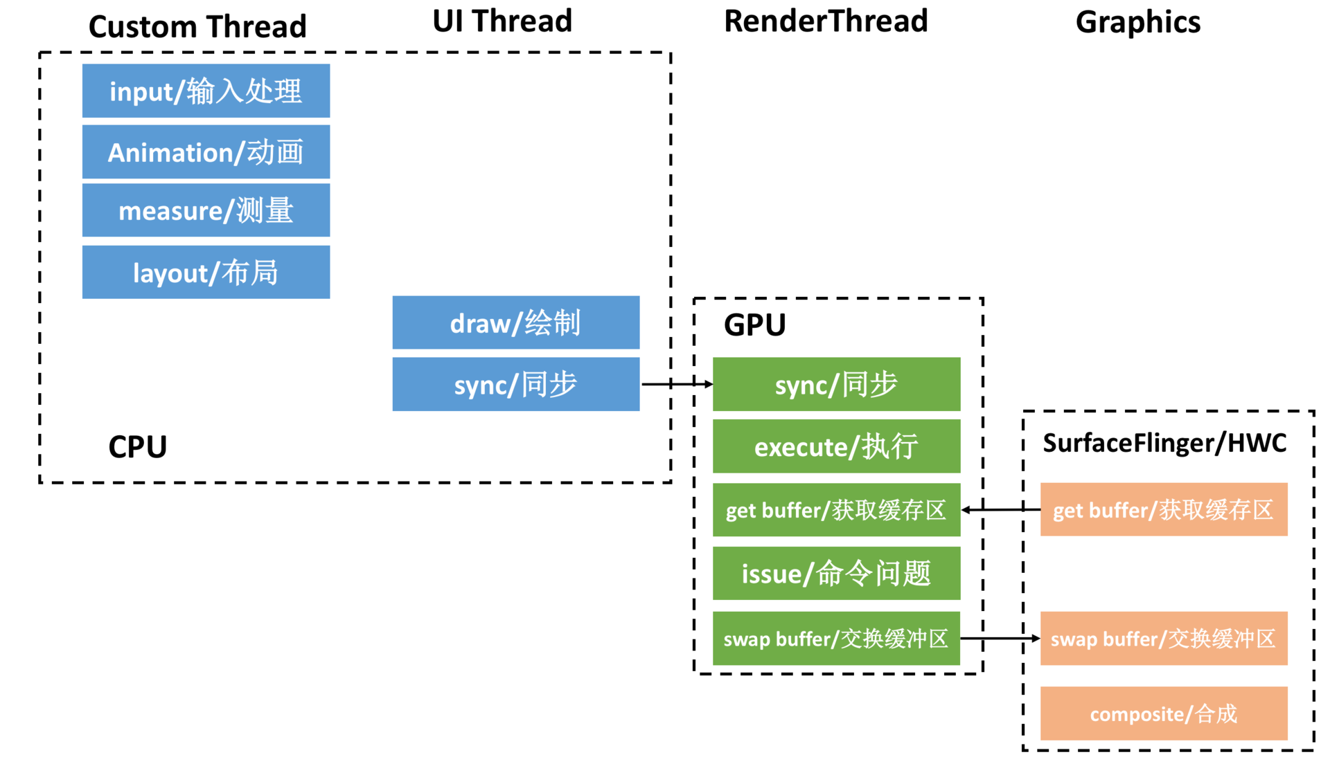 让我们再重温一下UI渲染的阶段流程图,我们的目标是实现60 fps,这意味着渲染的所有操作都必须在16 ms(= 1000 ms/60 fps)内完成。