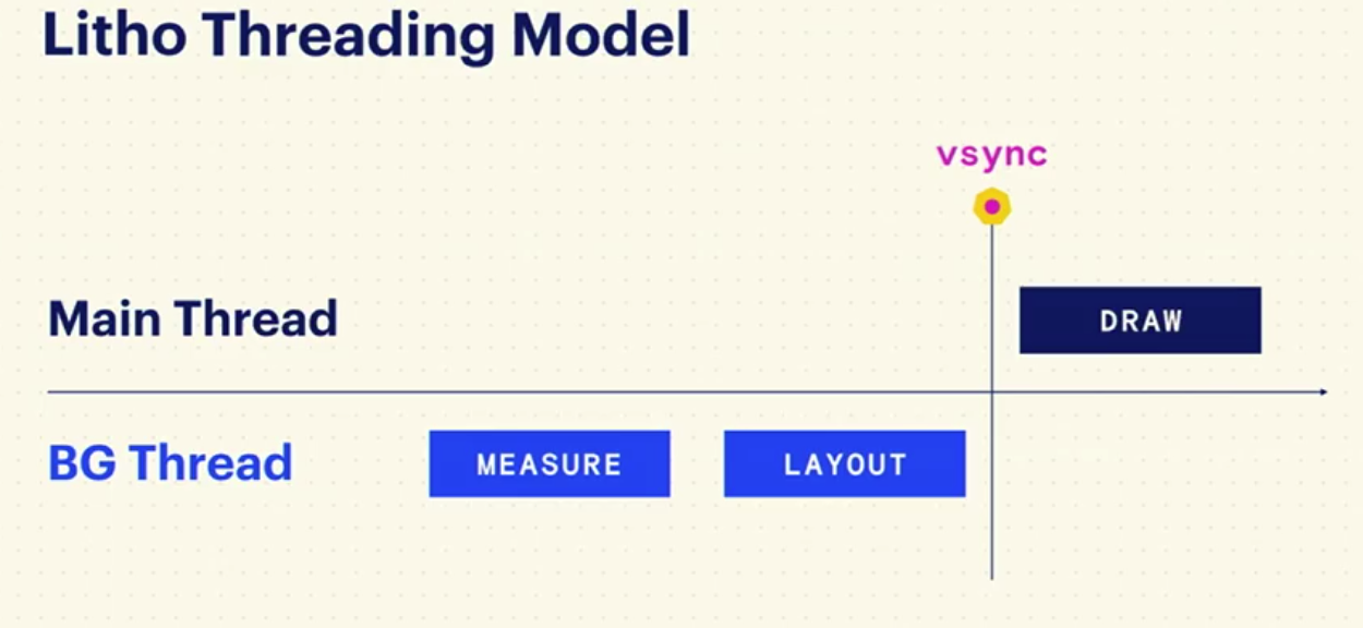 Litho如我前面提到的PrecomputedText一样,把measure和layout都放到了后台线程,只留下了必须要在主线程完成的draw,这大大降低了UI线程的负载。它的渲染流水线如下:
