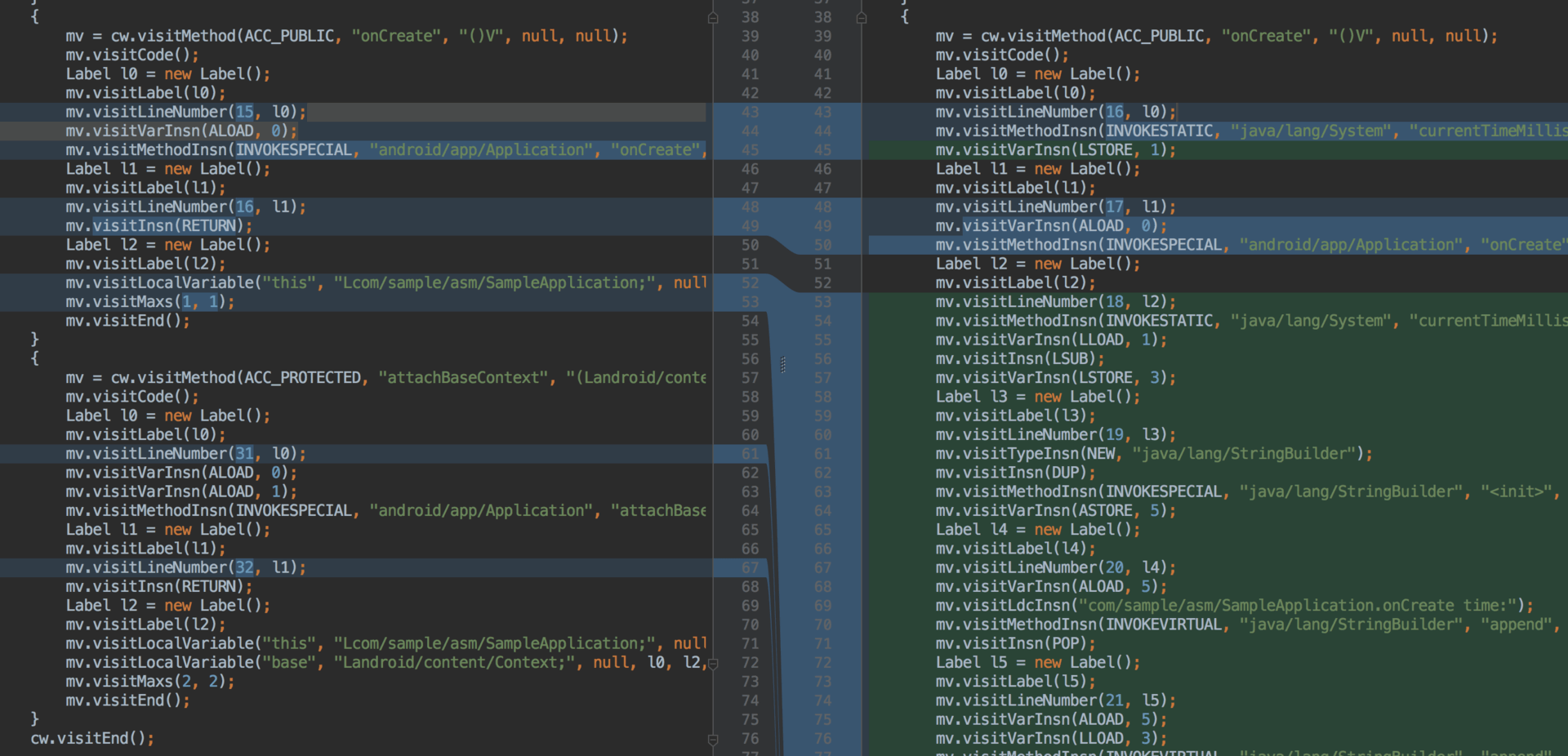 那这样“差异”代码怎么样转化了ASM代码呢?ASM Bytecode Outline还有一个非常强大的功能,它可以展示相邻两次修改的代码差异,这样我们可以很清晰地看出修改的代码在字节码上的呈现。