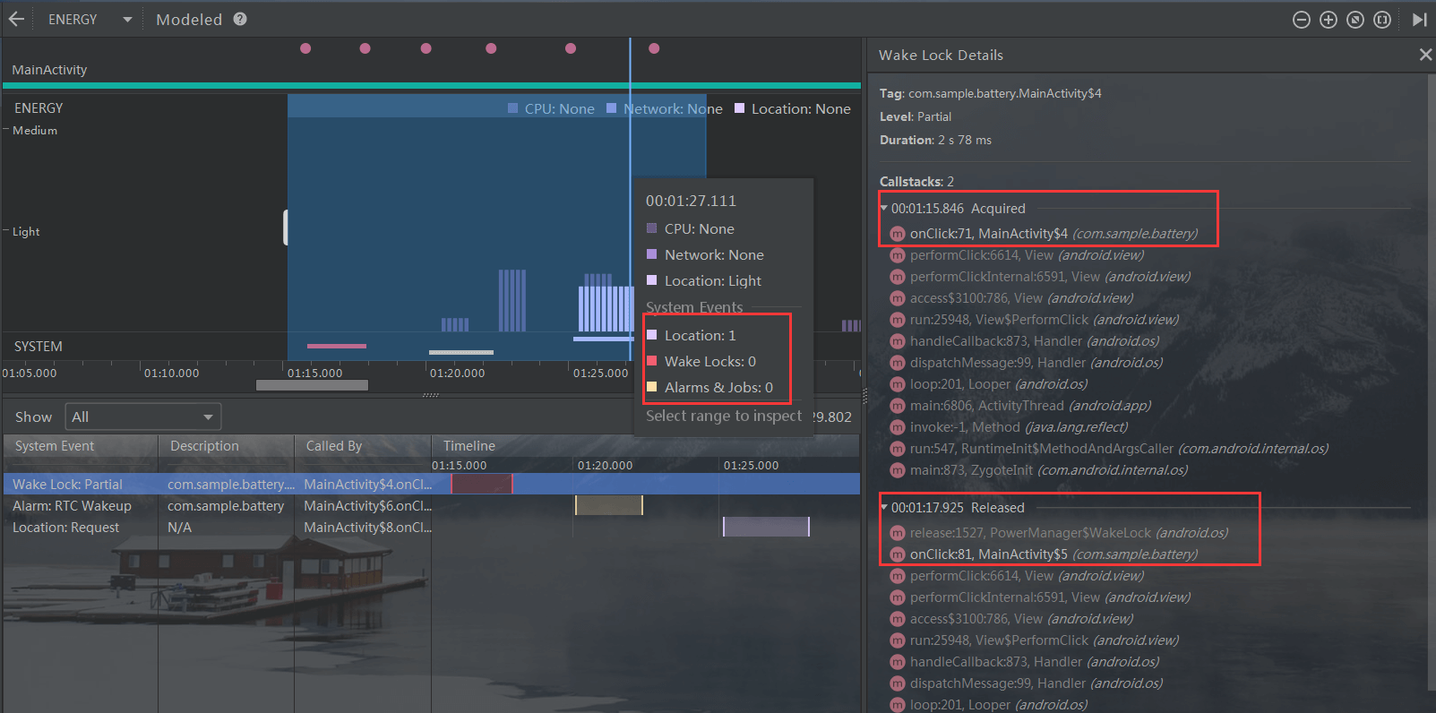 当然,强大的Studio在3.2后也有了强大的耗电量分析器,同样可以监测到这些信息,如下图所示(我使用的Studio版本为3.3)。