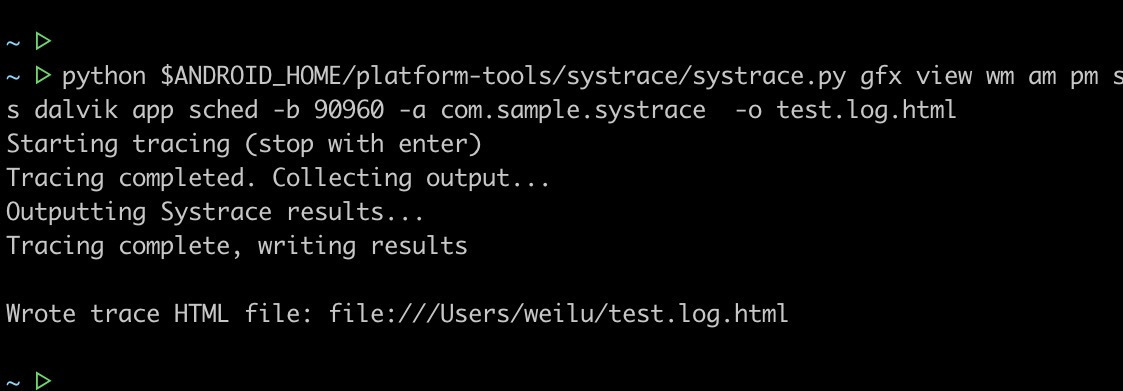 python $ANDROID_HOME/platform-tools/systrace/systrace.py gfx view wm am pm ss dalvik app sched -b 90960 -a com.sample.systrace -o test.log.html