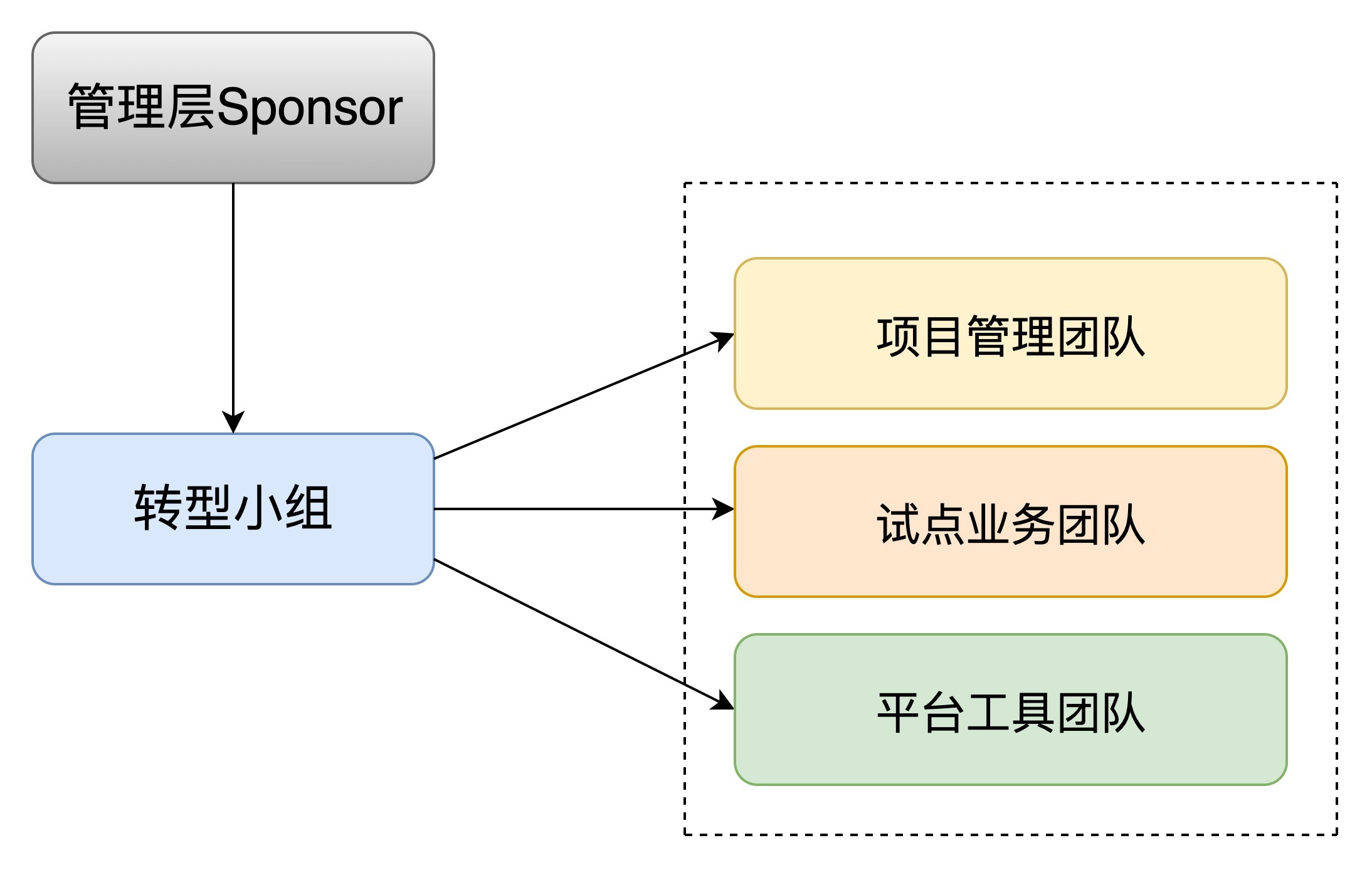 除了核心团队,管理团队和工具团队也很重要。我挂一个转型小组的团队组成示意图供你参考。当然,DevOps所倡导的是一专多能,跨领域的人才对于企业DevOps的实施同样不可或缺,在挑选小组成员的时候,这一点你也需要注意下。