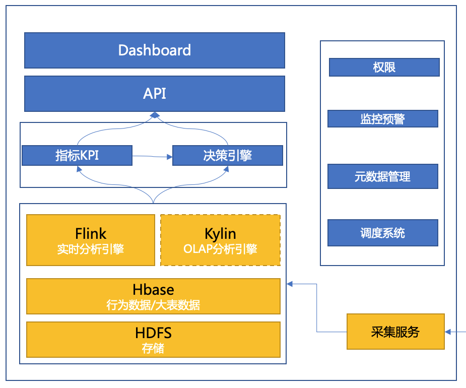 我再给你分享一幅数据度量的架构图。从这张图中,你可以看到,底层数据都是基于HBase和HDFS来存储的。