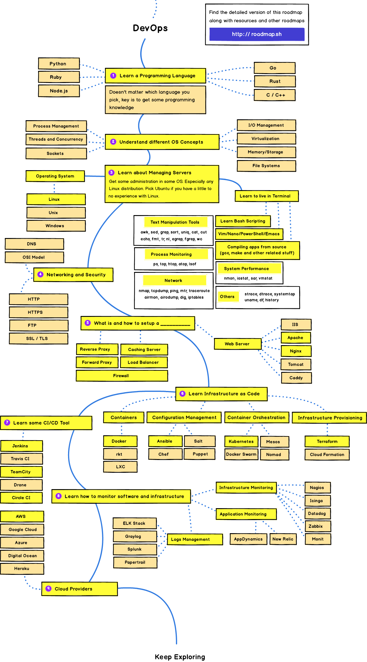 除此之外,DevOps似乎又跟软件工程的方方面面有着说不清的关系。我跟你分享一幅DevOps技能发展路线图,根据这幅路线图,你要从编程语言入手,理解操作系统原理、系统性能、网络安全、基础设施即代码、CI/CD、运维监控和云技术等等。
