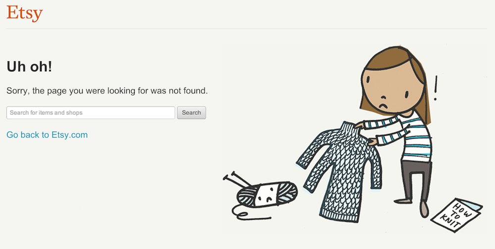 当Etsy的网站不可用的时候,你看到的是一个小姑娘在织毛衣的画面,而这个毛衣竟然有三只袖子。