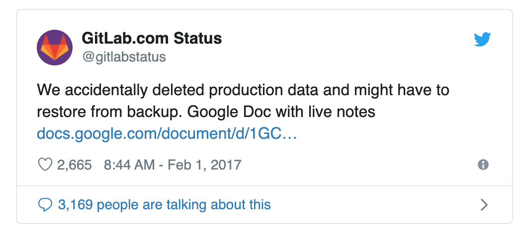 问题回溯的资料: https://about.gitlab.com/2017/02/10/postmortem-of-database-outage-of-january-31/