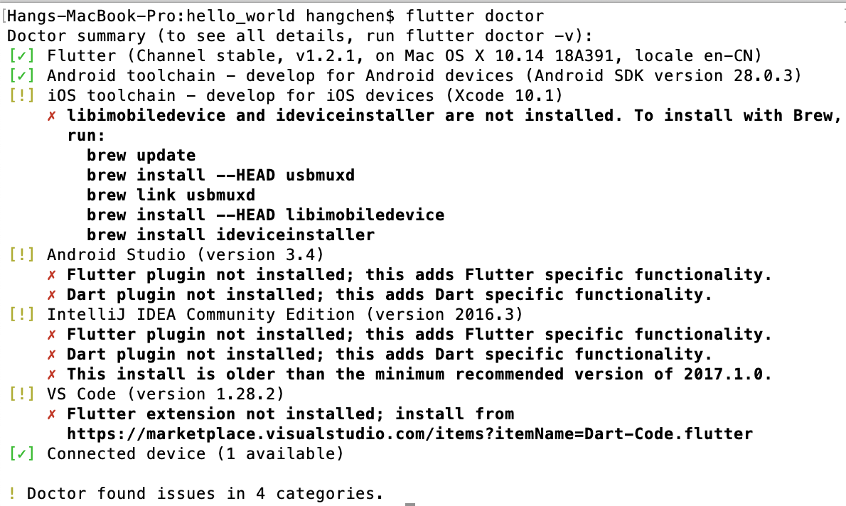 可以看到,flutter doctor检测出了iOS工具链、Android Studio工程这两项配置中的问题。此外,由于我的电脑还安装了IDEA和VS Code,而它们也是Flutter官方支持的IDE,因此也一并检测出了问题。