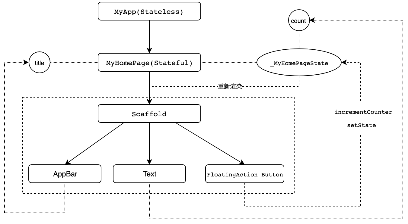 这里需要注意的是:状态的更改一定要配合使用setState。通过这个方法的调用,Flutter会在底层标记Widget的状态,随后触发重建。于我们的示例而言,即使你修改了_counter,如果不调用setState,Flutter框架也不会感知到状态的变化,因此界面上也不会有任何改变(你可以动手验证一下)。