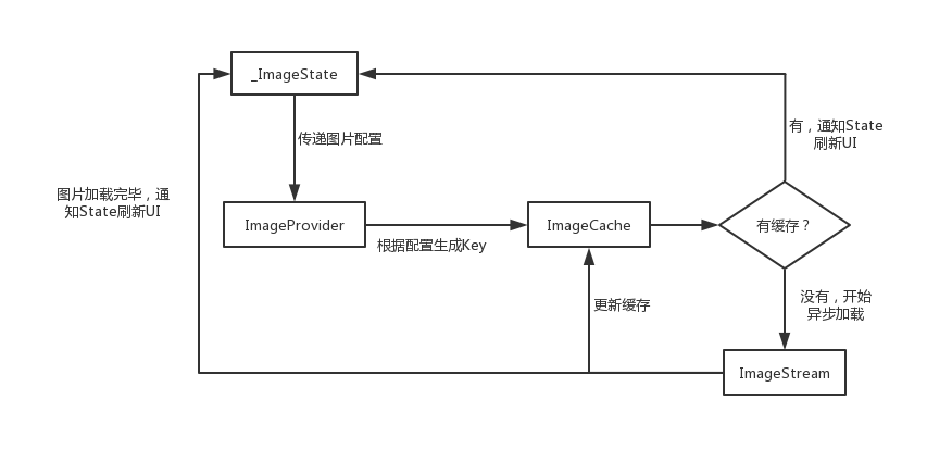 首先,ImageProvider根据_ImageState中传递的图片配置生成对应的图片缓存key;然后,去ImageCache中查找是否有对应的图片缓存,如果有,则通知_ImageState刷新UI;如果没有,则启动ImageStream开始异步加载,加载完毕后,更新缓存;最后,通知_ImageState刷新UI。