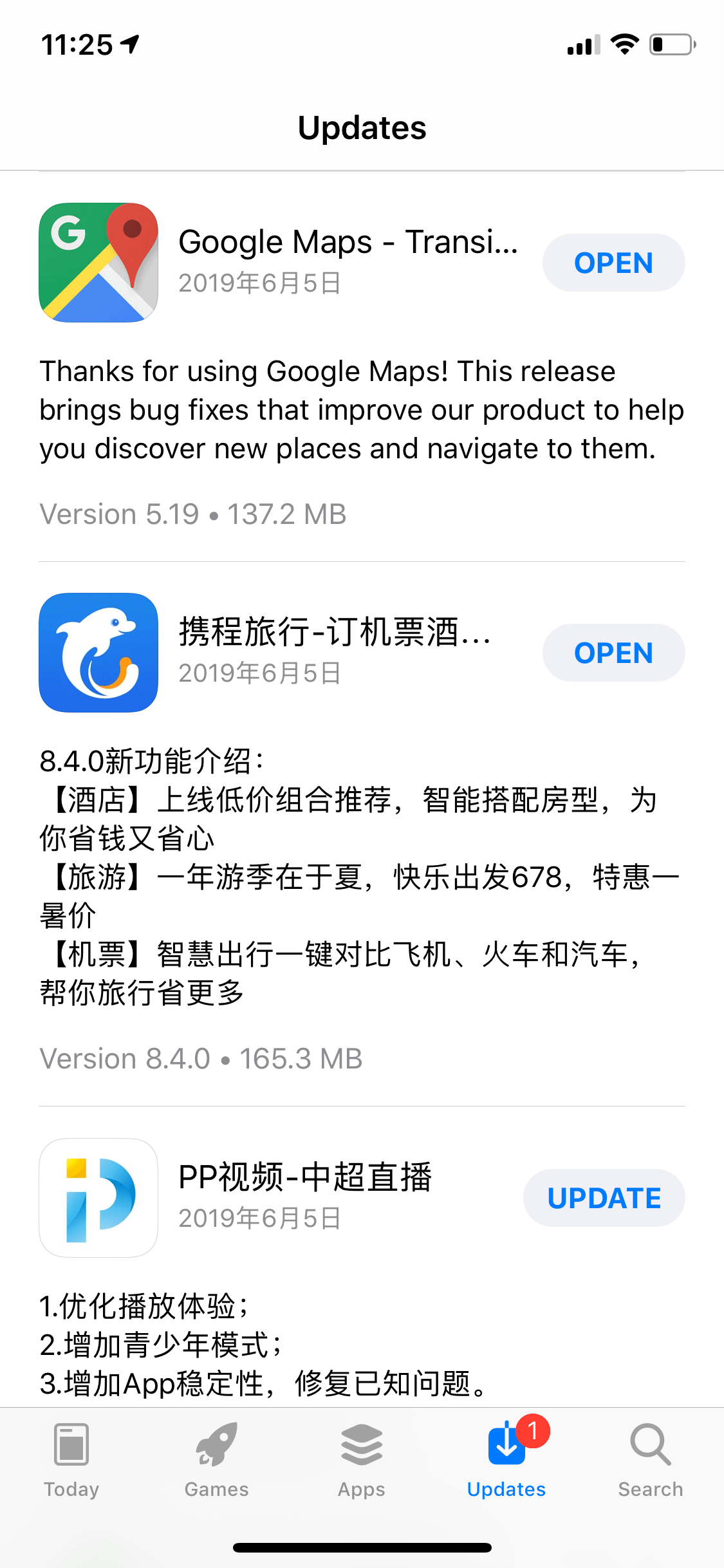 下图是App Store的升级项UI示意图,图里的每一项,都有应用Icon、名称、更新日期、更新简介、应用版本、应用大小以及更新/打开按钮。可以看到,这里面的UI元素还是相对较多的,现在我们希望将升级项UI封装成一个单独的控件,节省使用成本,以及后续的维护成本。