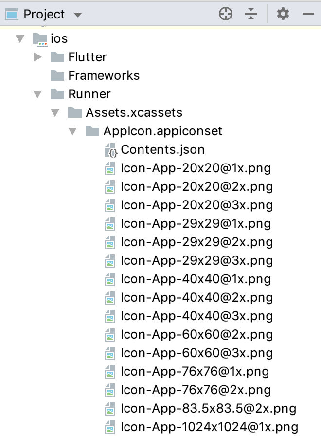 对于iOS平台,启动图位于根目录ios/Runner/Assets.xcassets/AppIcon.appiconset下。同样地,我们只需要遵守对应的像素密度标准,将其替换为目标资源并保留原始图标名称即可: