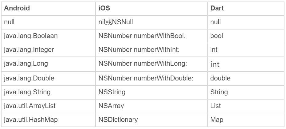 图2 Android、iOS和Dart平台间的常见数据类型转换