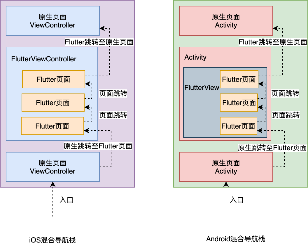 Flutter跳转至原生页面的两种场景,如下图所示: