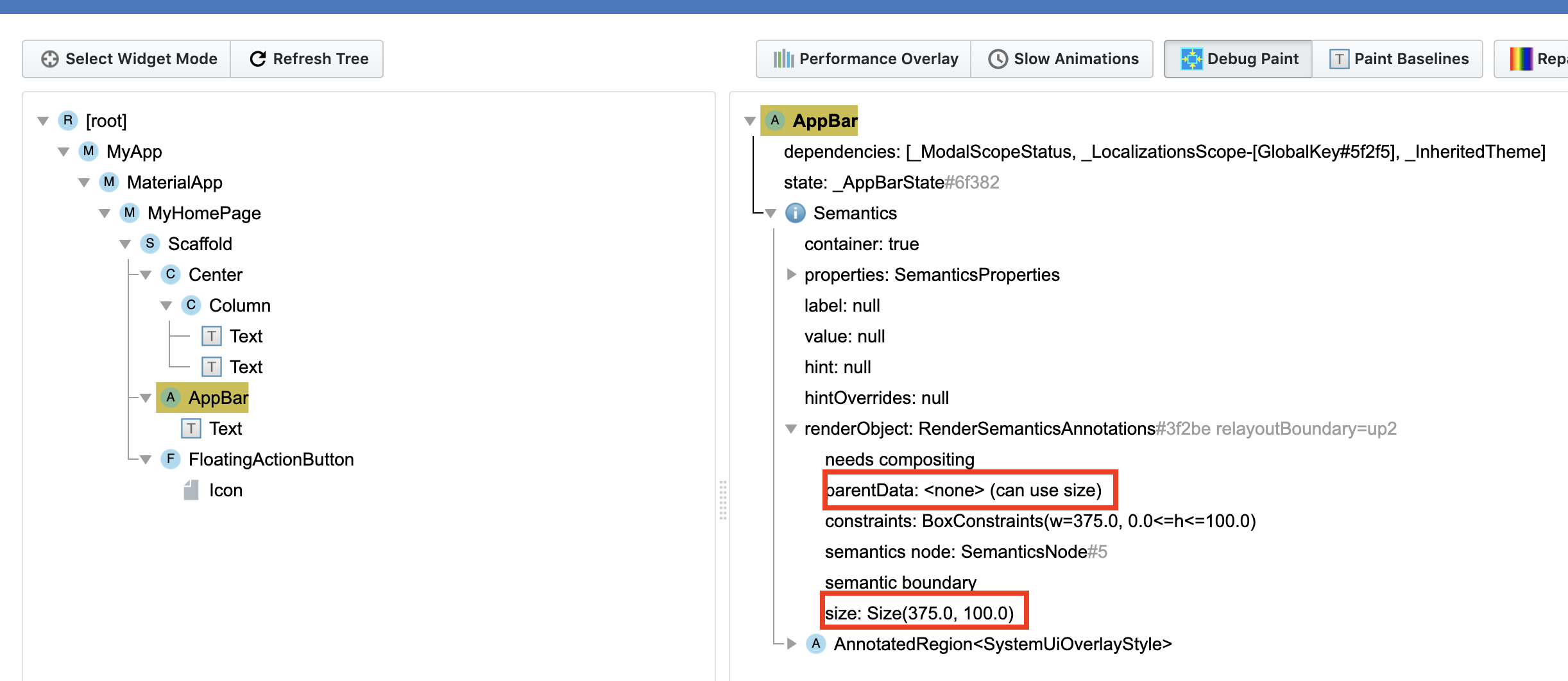 为了确认Column在垂直方向是充满其父Widget剩余空间的,我们首先需要确定其父Widget在垂直方向上的另一个子Widget,即AppBar的信息。我们点击Flutter Inspector面板左侧中的AppBar控件,右侧对应显示了它的具体视觉信息。