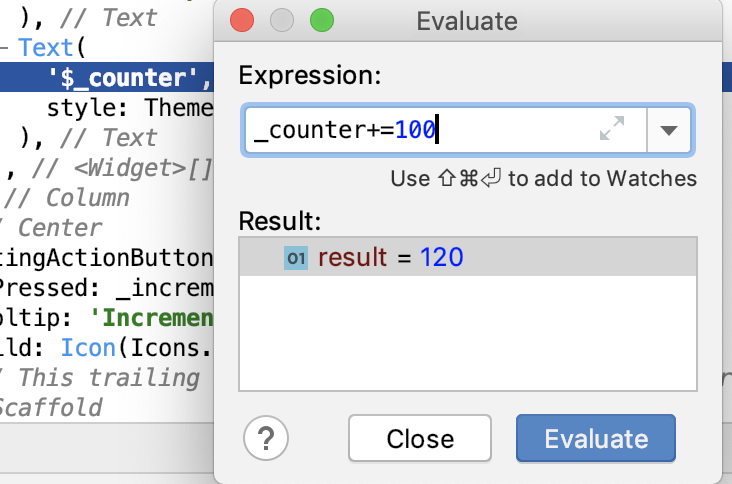 接下来,我们以Flutter默认的计数器应用模板为例,观察代码中_counter值的变化,体会断点调试的全过程。