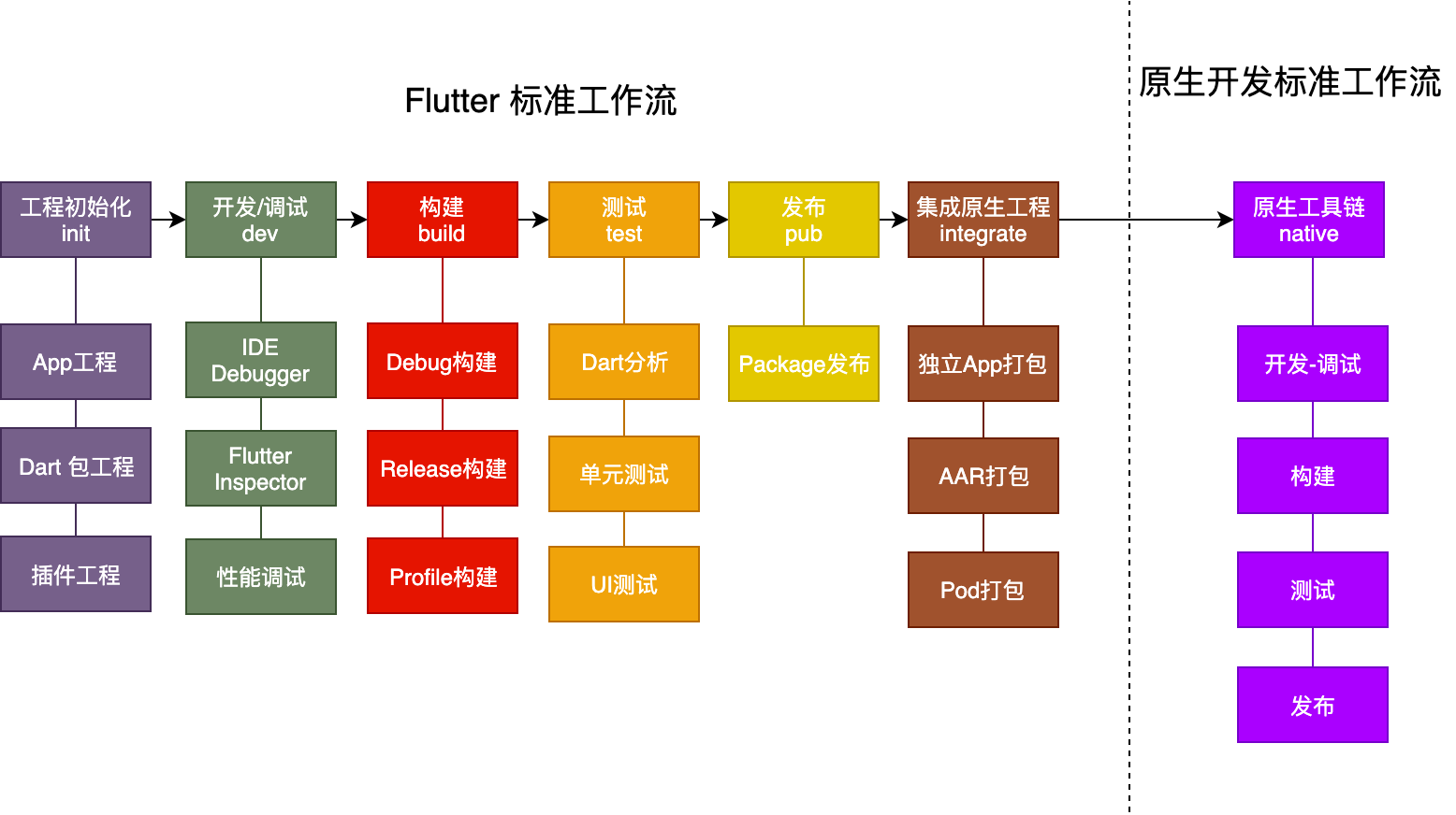 前6个阶段是Flutter的标准工作流,最后一个阶段是原生开发的标准工作流。