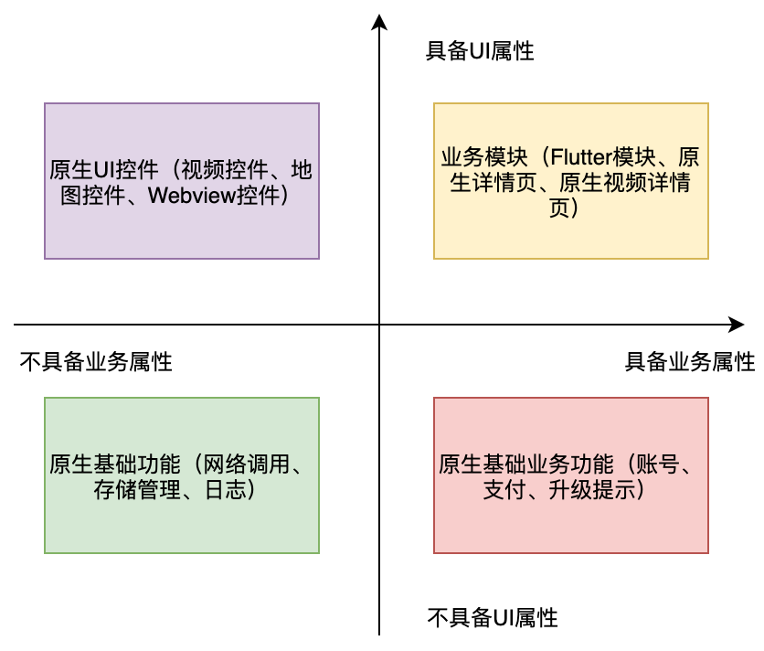 在第41篇文章中,我们通过四象限分析法,把纯Flutter应用按照业务和UI分解成4类。同样的,混合工程的功能单元也可以按照这个分治逻辑分为4个维度,即不具备业务属性的原生基础功能、不具备业务属性的原生UI控件、不具备UI属性的原生基础业务功能和带UI属性的独立业务模块。