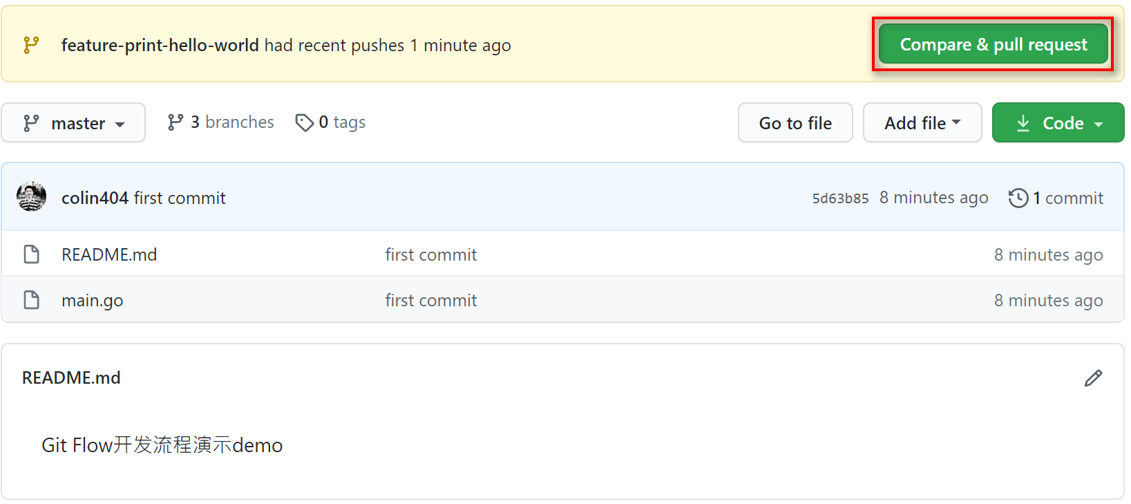 假设我们的 Git 项目名为 gitflow-demo,项目目录下有 2 个文件,分别是 README.md 和 main.go,内容如下。