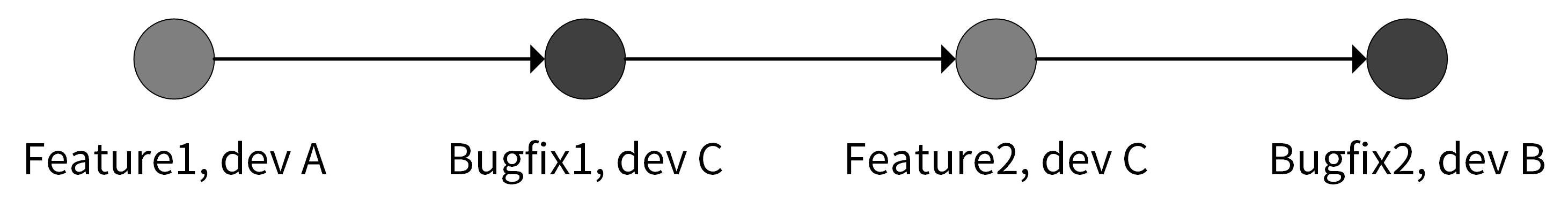 A、B、C 为 3 位开发者,每位开发者都在本地有一份远程仓库的拷贝:本地仓库。A、B、C 在本地的 master 分支开发完代码之后,将修改后的代码commit到远程仓库,如果有冲突就先解决本地的冲突再提交。在进行了一段时间的开发之后,远程仓库 master 分支的日志可能如下图所示: