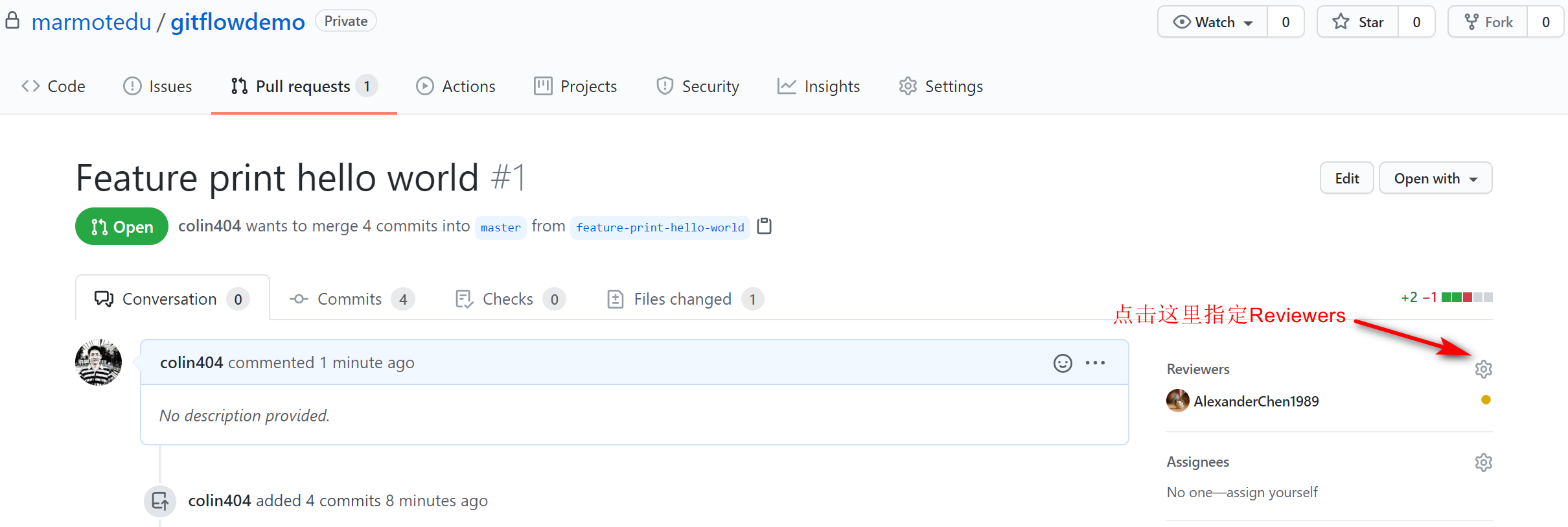 创建完 pull request 之后,我们就可以指定 Reviewers 进行 code review,如下图所示。