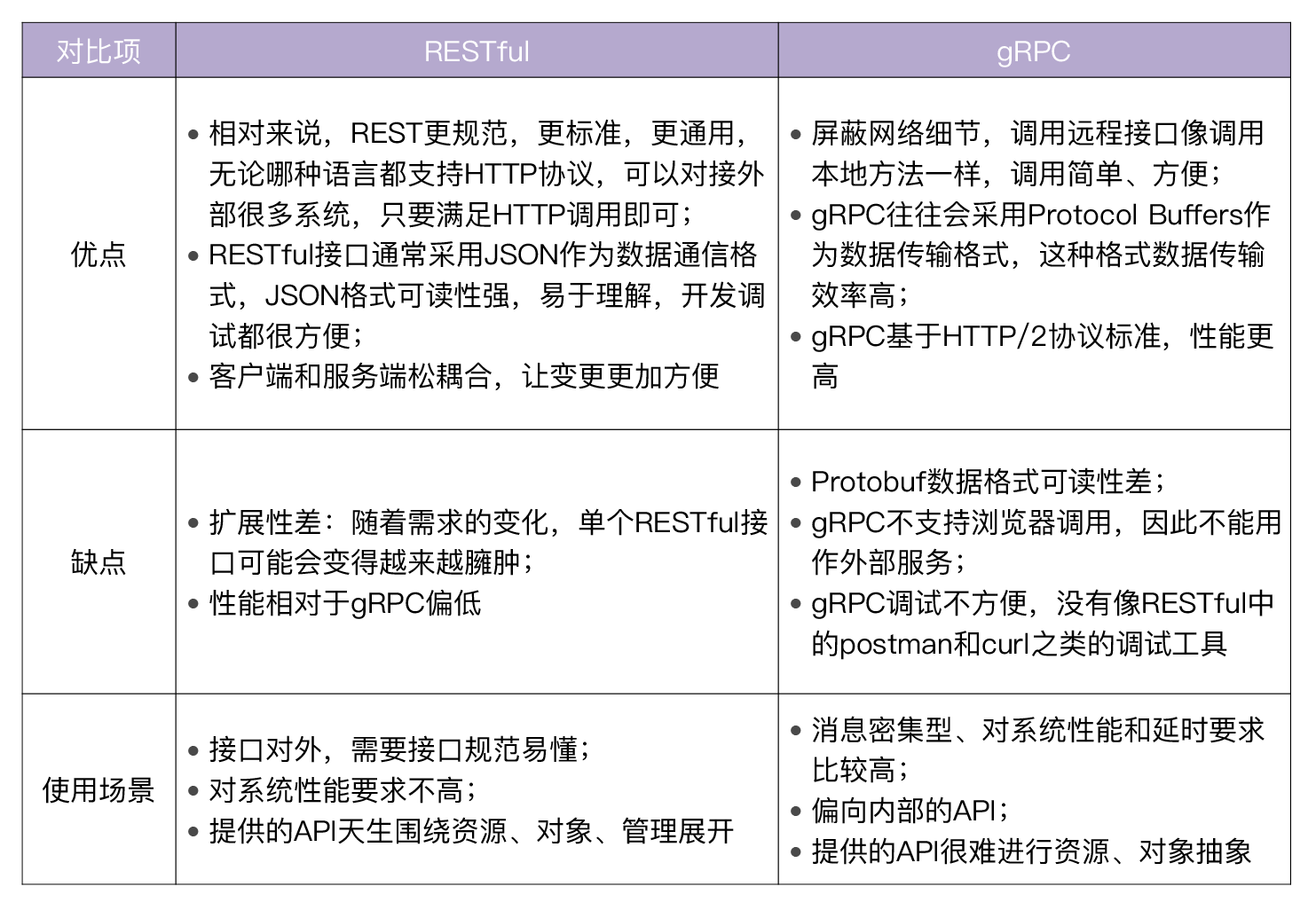 到这里,今天我们已经介绍完了gRPC API。回想一下我们昨天学习的RESTful API,你可能想问:这两种API风格分别有什么优缺点,适用于什么场景呢?我把这个问题的答案放在了下面这张表中,你可以对照着它,根据自己的需求在实际应用时进行选择。