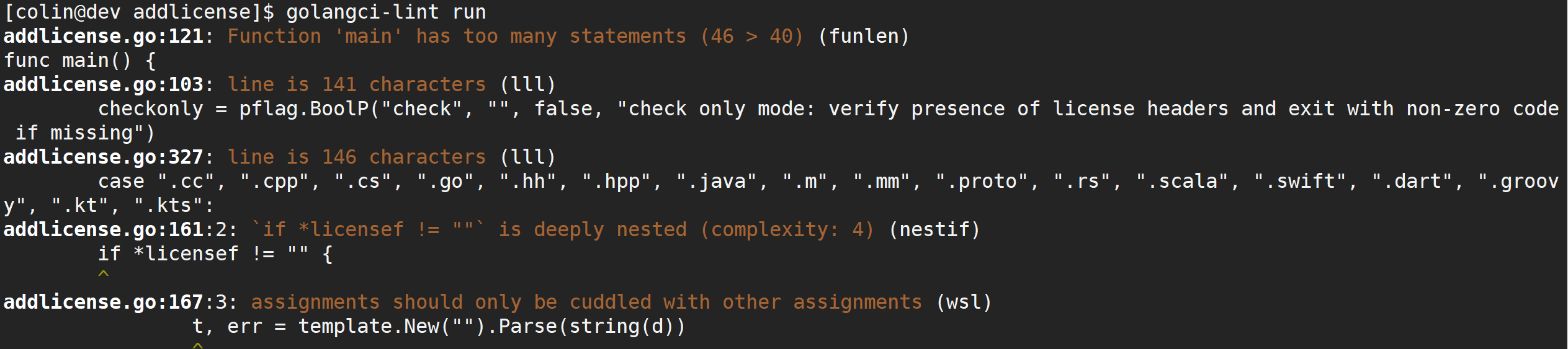 $ golangci-lint run --no-config -D godot,errcheck # 禁止运行指定的godot,errcheck liner