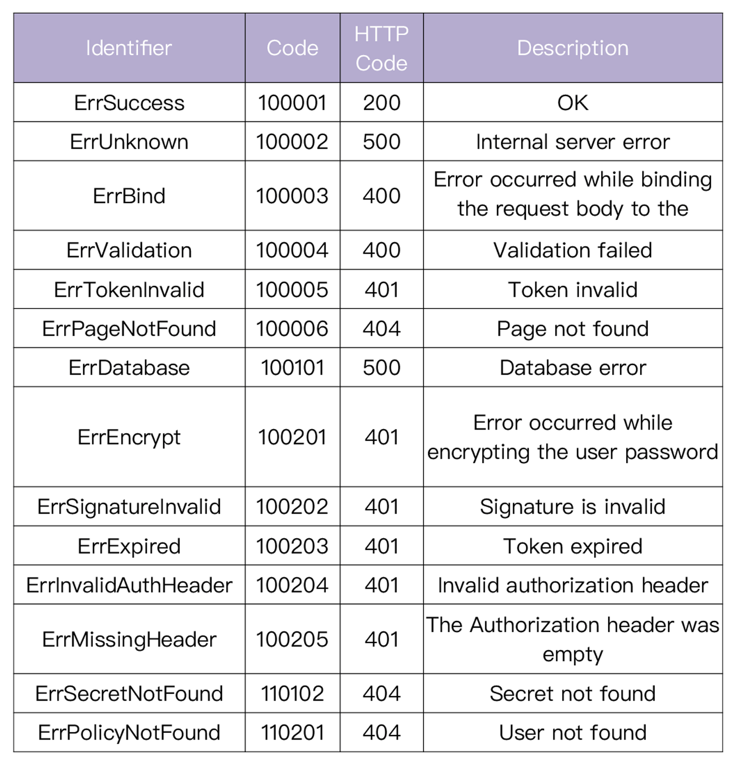 Code 代码从 100001 开始,1000 以下为 github.com/marmotedu/errors 保留 code。