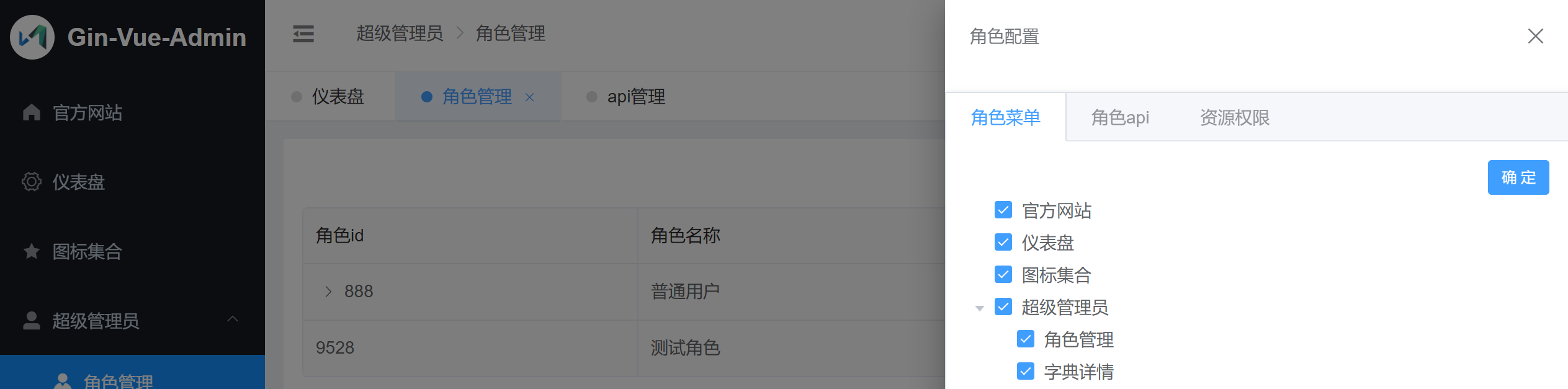 gin-vue-admin 是一个基于 Gin 和 Vue 开发的全栈前后端分离的后台管理系统,集成了 JWT 鉴权、动态路由、动态菜单、Casbin 鉴权、表单生成器、代码生成器等功能。gin-vue-admin 集成了 RBAC 权限管理模型,界面如下图所示: