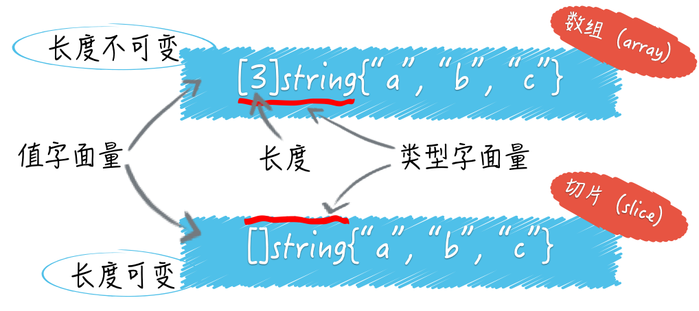 数组的长度在声明它的时候就必须给定,并且之后不会再改变。可以说,数组的长度是其类型的一部分。比如,[1]string[2]string就是两个不同的数组类型。