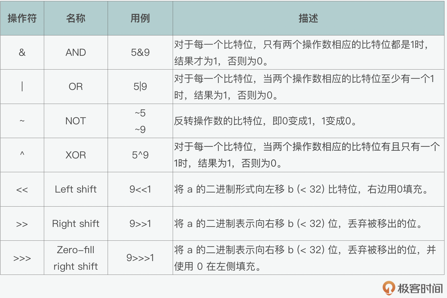 下面我们再来看看位移。这里又分为左移(<< Left shift),有符号右移(>> Right shift)和无符号右移(>>> Zero-fill right shift)。左移会将 a 的二进制形式向左移 b (< 32) 比特位,右边用0填充,所以9<<1的结果就是18。而有符号右移则会将 a 的二进制表示向右移 b (< 32) 位,丢弃被移出的位,所以9>>1的结果就是4。最后无符号右移会将 a 的二进制表示向右移 b (< 32) 位,丢弃被移出的位,并使用 0 在左侧填充,所以9>>1的结果就是2147483643。