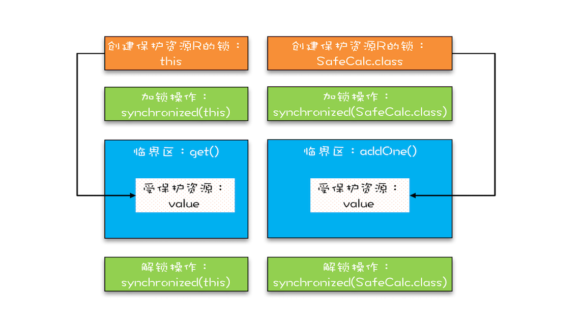 如果你仔细观察,就会发现改动后的代码是用两个锁保护一个资源。这个受保护的资源就是静态变量value,两个锁分别是this和SafeCalc.class。我们可以用下面这幅图来形象描述这个关系。由于临界区get()和addOne()是用两个锁保护的,因此这两个临界区没有互斥关系,临界区addOne()对value的修改对临界区get()也没有可见性保证,这就导致并发问题了。